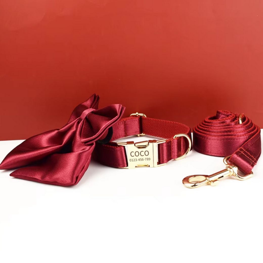 【レッド×光沢サテン】迷子札付犬の首輪&選べるリボン、リード