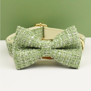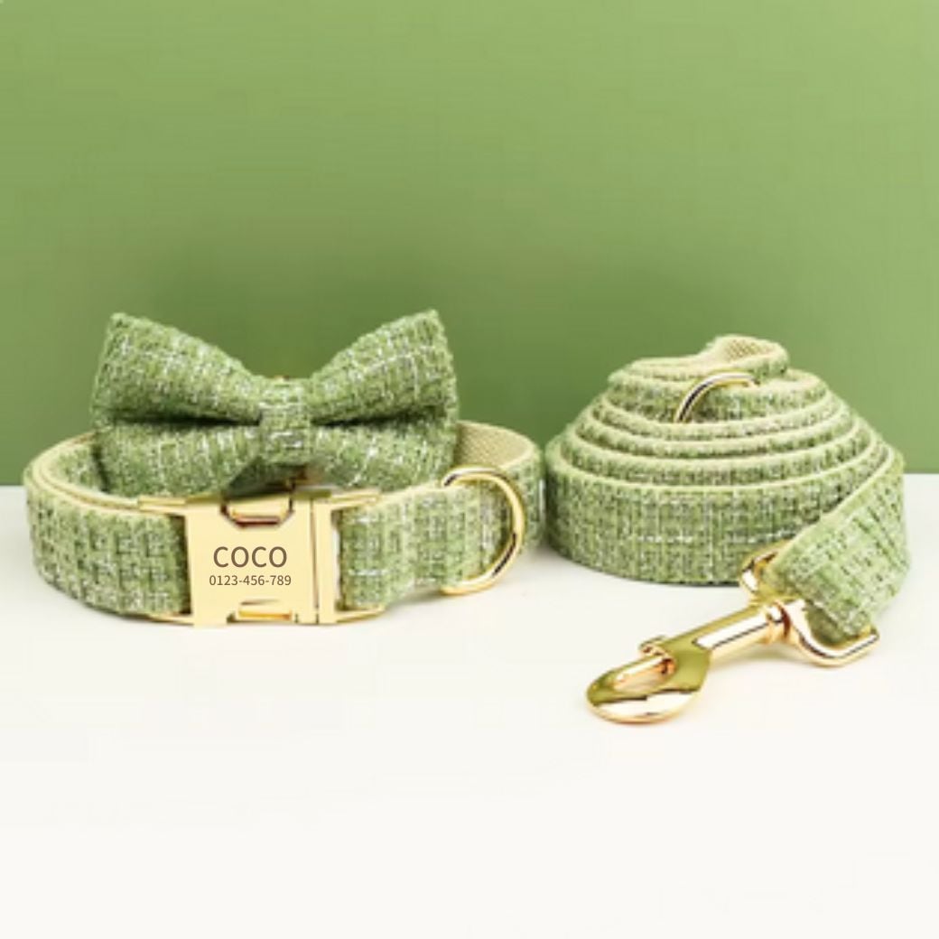 【抹茶×ツイード】迷子札付犬の首輪&選べるリボン、リード
