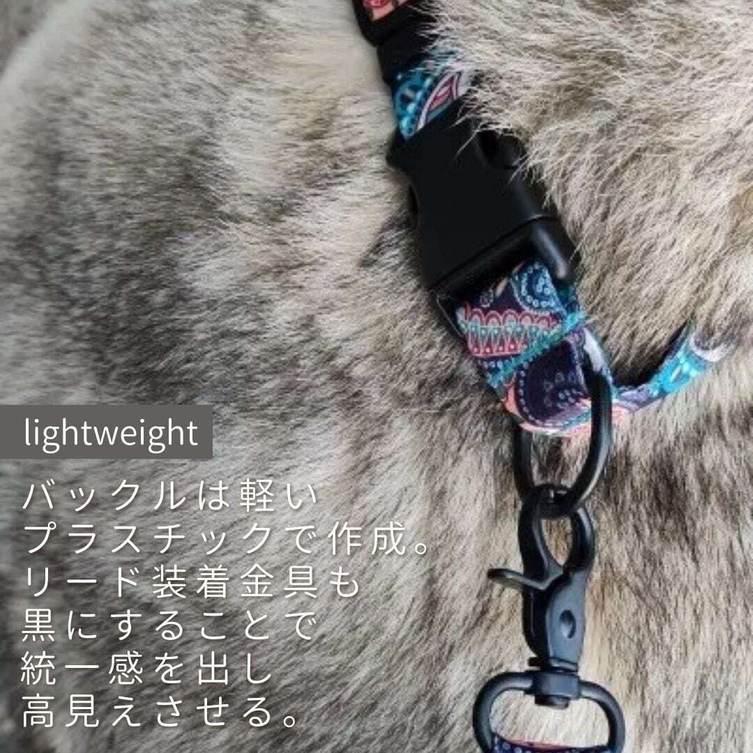 小型犬から大型犬まで対応可能です。また、耐衝撃性に優れたバックルは高い引張り強さと硬度があります。