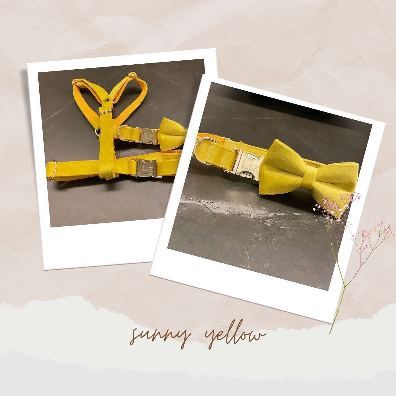 NEW【ベルベット・サニーイエロー】迷子札付犬のハーネスと選べるリードとコサージュセット