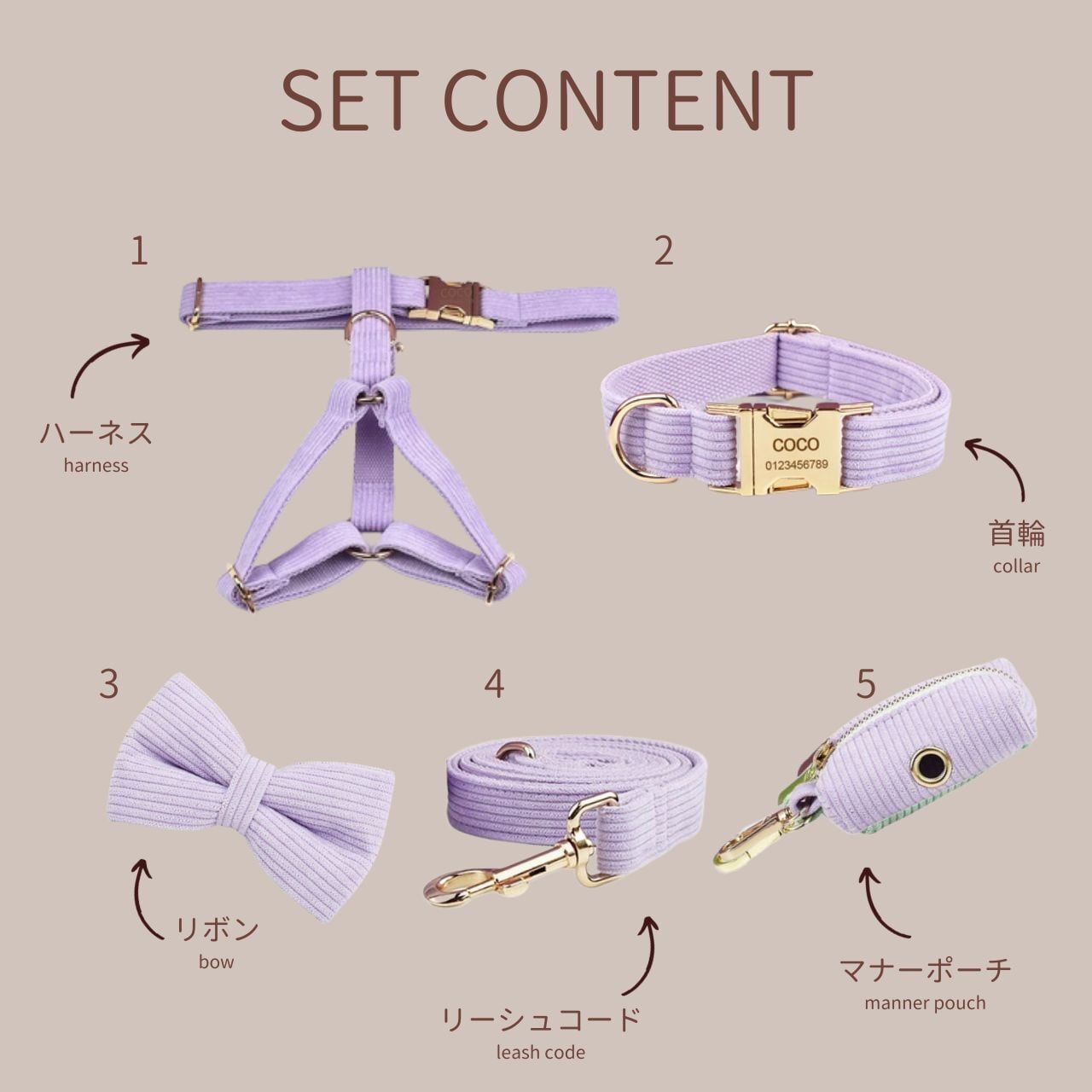NEW5点セット【コーデュロイ・コバルトバイオレット】迷子札付犬のハーネスと首輪、リード、リボン・ポーチセット