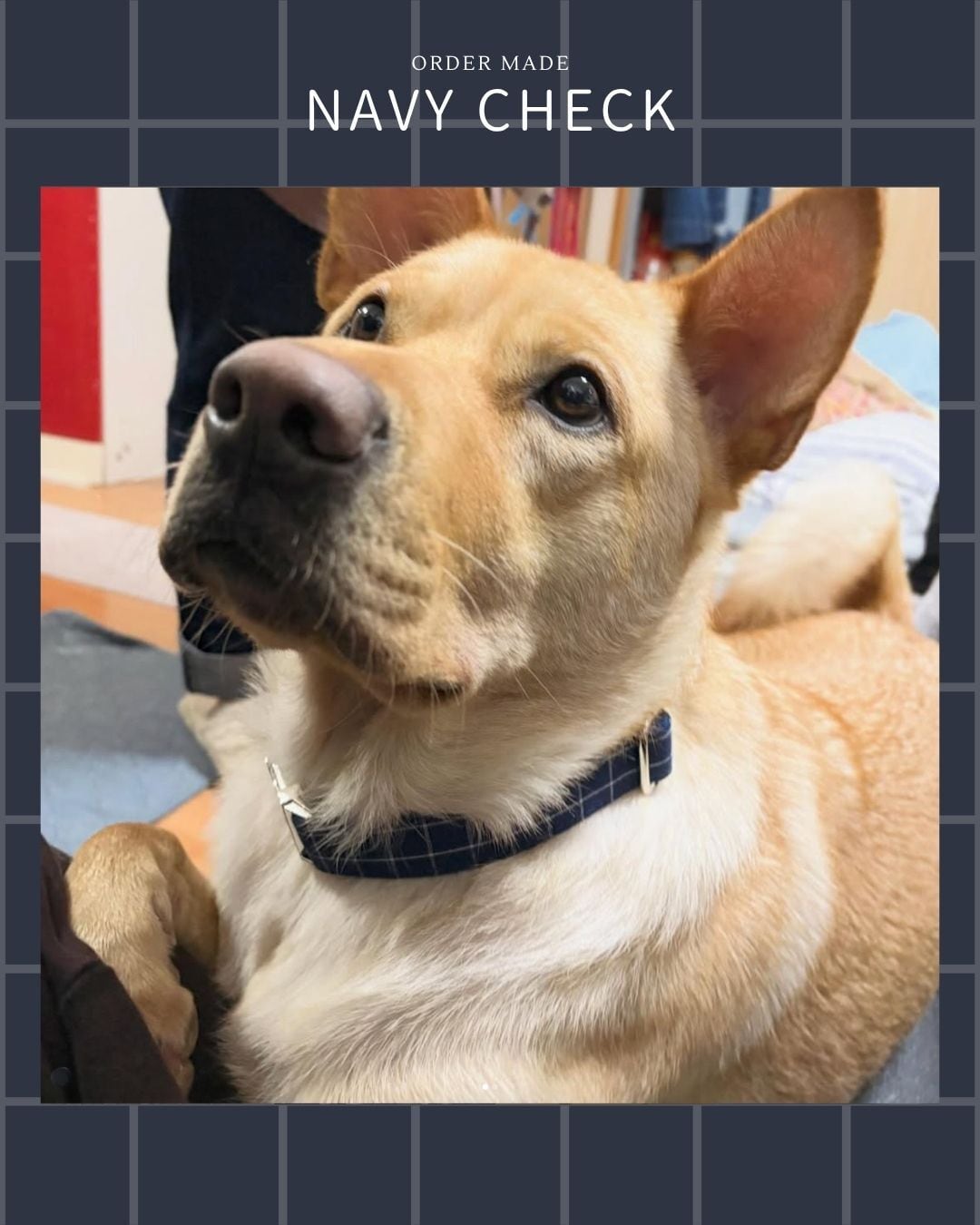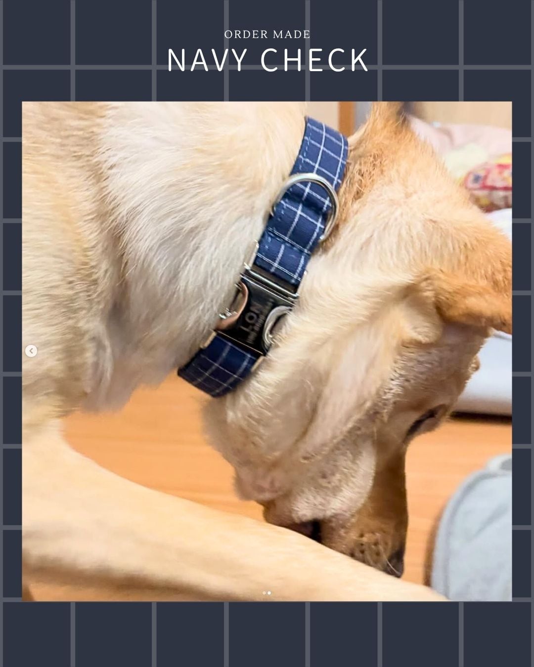 【ネイビーチェック】迷子札付犬の首輪、選べるリード、リボン