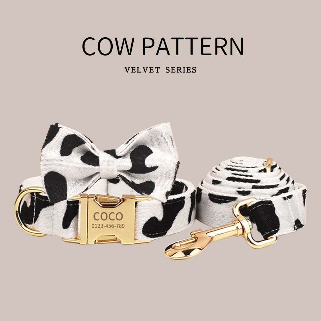 NEW5点セット【ベルベット×牛柄】迷子札付犬のサイドバックルハーネスと首輪、リード、リボンポーチセット