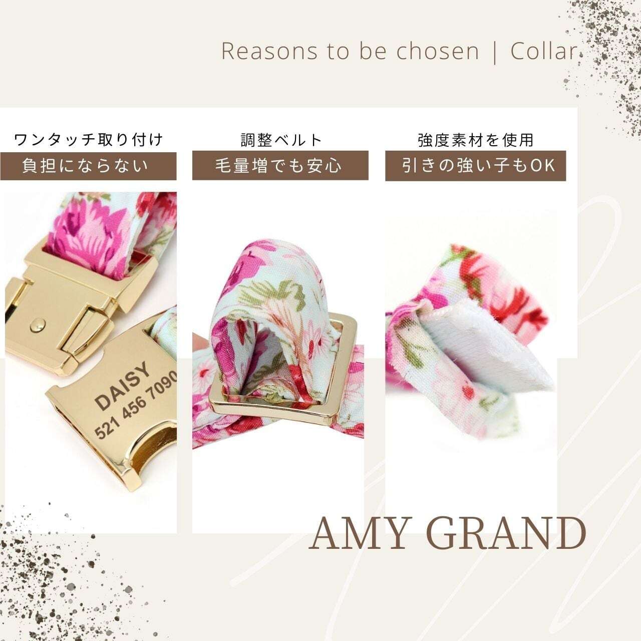 ハーネス・首輪の金属バックル部分に、ペットの名前、連絡電話を彫刻できるので、迷子になっても安心。