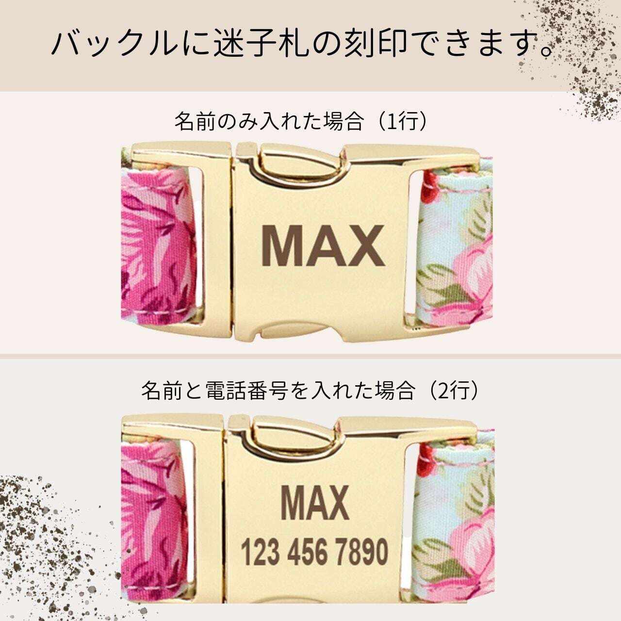 ハーネス・首輪の金属バックル部分に、ペットの名前、連絡電話を彫刻できるので、迷子になっても安心。