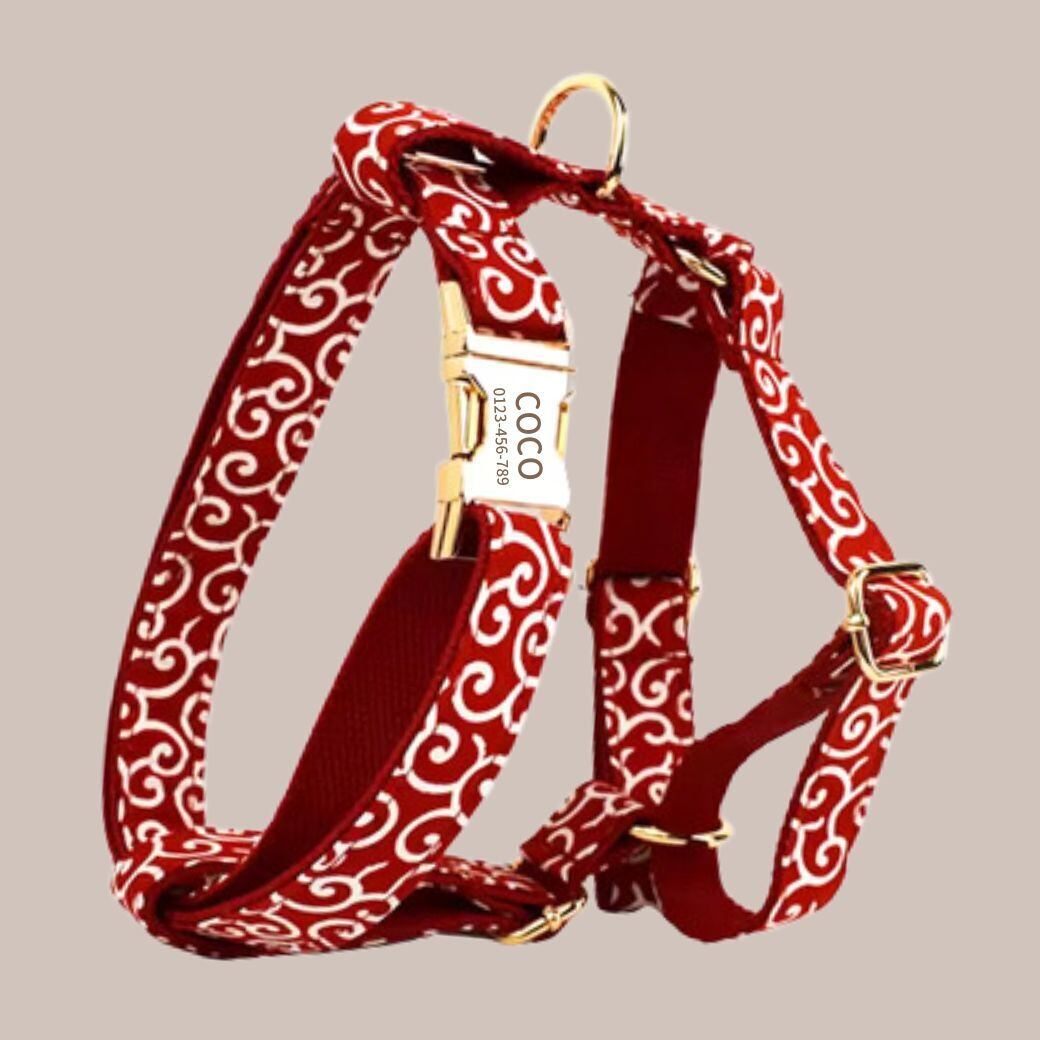 【唐草模様レッド】迷子札付犬のサイドバックルハーネスと選べるリードとリボン